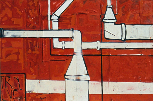 CV033 Mike Rollins Red Valves September, 1994 Oil on canvas collage on 3 doors bolted together 80 x 118 in.